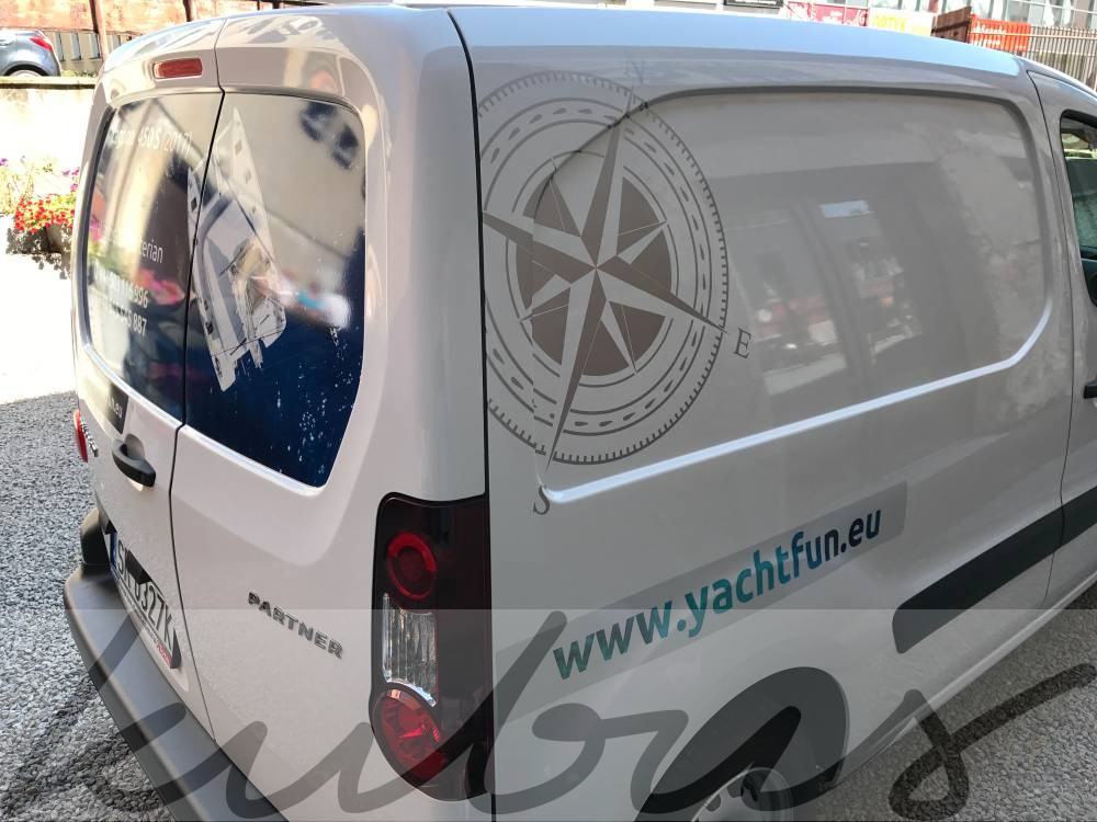 Wykonanie naklejek wg projektu zawierającego grafikę plotowaną ale również zdjęcia klejone na samochodzie z folii samochodowej laminowanej.